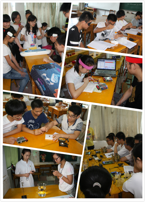 科普班的170多名中學生被分為三個組,每個組下設三個小班。志愿者分為感知覺組、電生理組、腦疾病組,每個組由10多名研究員、副研究員和博士生組成,三天輪流給三個不同班的中學生開設科普講座和科普小實驗。感知覺組詳細講述了感覺經驗對大腦的影響、聽覺產生的神經機制,以及腦科學研究中的常見模式生物,并讓大家通過人體實驗親自感受皮膚分辨閾、韋伯常數等科學概念,通過視覺運動的錯覺、橡皮手錯覺、視聽整合等趣味小實驗,來強化剛剛學到的神經科學知識。電生理組為學生普及了神經細胞電活動的產生與傳播、學習記憶等方面的科學知識,以及記錄神經活動的不同方法、轉基因動物與腦科學的關系,并在出發前精心設計,日夜趕工,為實驗量身定制了輕巧便捷的生物電測量儀,通過熱激活通道改變果蠅行為、光遺傳學控制小鼠行為、測試人體生物電、腦電對抗游戲、蟑螂腿跳舞等實驗,來加深中學生對腦電圖、肌電圖、動作電位、反應時長等基本概念的理解。腦疾病組詳細介紹了神經系統性疾病、體育鍛煉、睡眠與大腦功能的關系,并通過自制條件化裝置,以小鼠、果蠅和斑馬魚為實驗對象,觀察與學習記憶、運動控制、情緒調節相關的動物行為。鐘春玖、于翔、徐寧龍、楊輝、張洪鈞5位研究員除了開設科普講座以外,還與學生們開展了座談,深入了解了他們的學習、生活、興趣等。