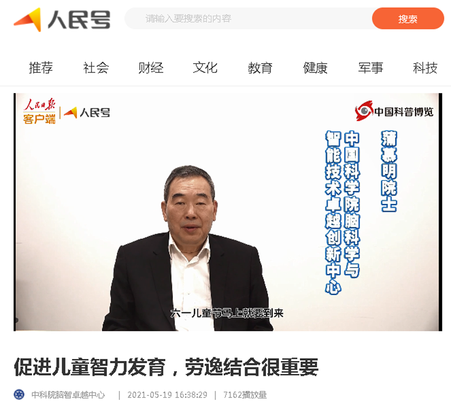 中科院腦智卓越中心學術主任蒲慕明院士是社會責任感特別強烈的科學家,長期關注青少年兒童的成長,此次公眾日活動中,他充分結合腦科學的學科特色和研究優勢,早早錄制了科普視頻《兒童智力發育》,從神經網絡發育角度,強調了兒童培養過程中,豐富環境和充足睡眠對智力發育的重要性,視頻在人民號、科普博覽、微信視頻號播放后,引起廣大公眾的關注,為社會健康培養祖國的未來提供了權威的參考。
