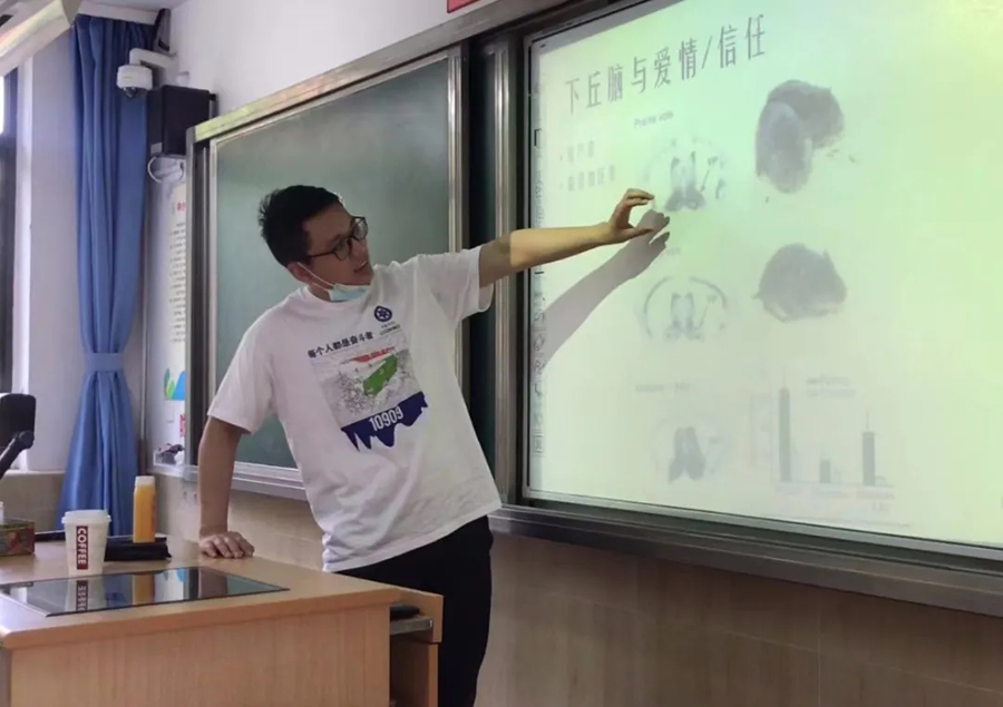 5月21日下午,中科院腦智卓越中心李毅研究員、竇艷儂副研究員、李葉菲博士、蔣夢萍博士、焦卓磊博士、王瑩博士、胡港研究生、吳超研究生根據位育初中各班級的特點,量身定制了“心靈閃電”“不耐痛是矯情么”“大腦通識”“共情背后的秘密”“神奇的下丘腦”“無創腦調控”“干細胞治療腦疾病”“神奇動物睡哪里?” 八個主題的科普講座。科普志愿者通過大量通俗易懂的視頻、音頻及圖片資料,為初一八個班300多名同學們普及了腦神經方面的科學知識。由于題材新穎,事先準備充分,語言生動活潑,四十分鐘的課上,同學們被貼近生活的事例,新鮮有趣的知識深深吸引。現場每個問題都能得到同學們的踴躍討論、發言。一些課外知識豐富的同學更是大膽質疑,提出自己的困惑。科普講座不僅激發了同學們對生活中科學知識的探索欲,了解到不少生活中的科學常識,更是增長了學生熱愛生命、熱愛生活的美好情感。