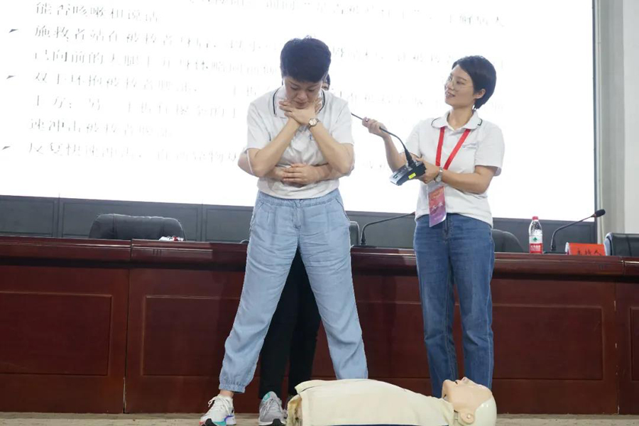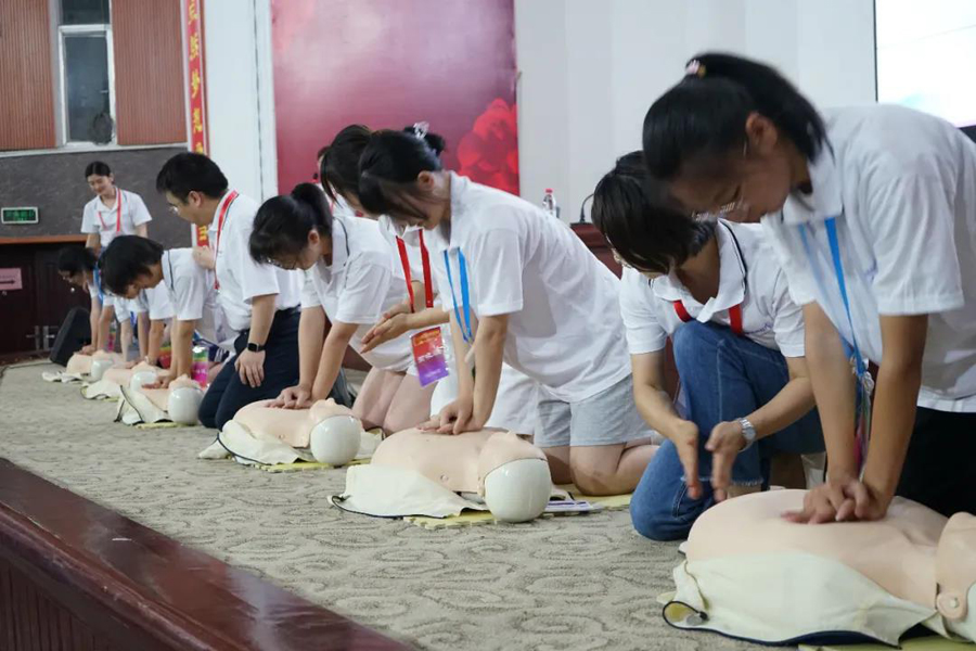 中南大學(xué)湘雅二醫(yī)院臨床技能中心主任李瑛教授為營(yíng)員們?cè)敿?xì)講解了心肺復(fù)蘇、傷口處理等急救知識(shí),劉振江副主任醫(yī)師與志愿者們進(jìn)行了現(xiàn)場(chǎng)演練,并對(duì)每個(gè)學(xué)員的急救細(xì)節(jié)逐一進(jìn)行了指導(dǎo)。