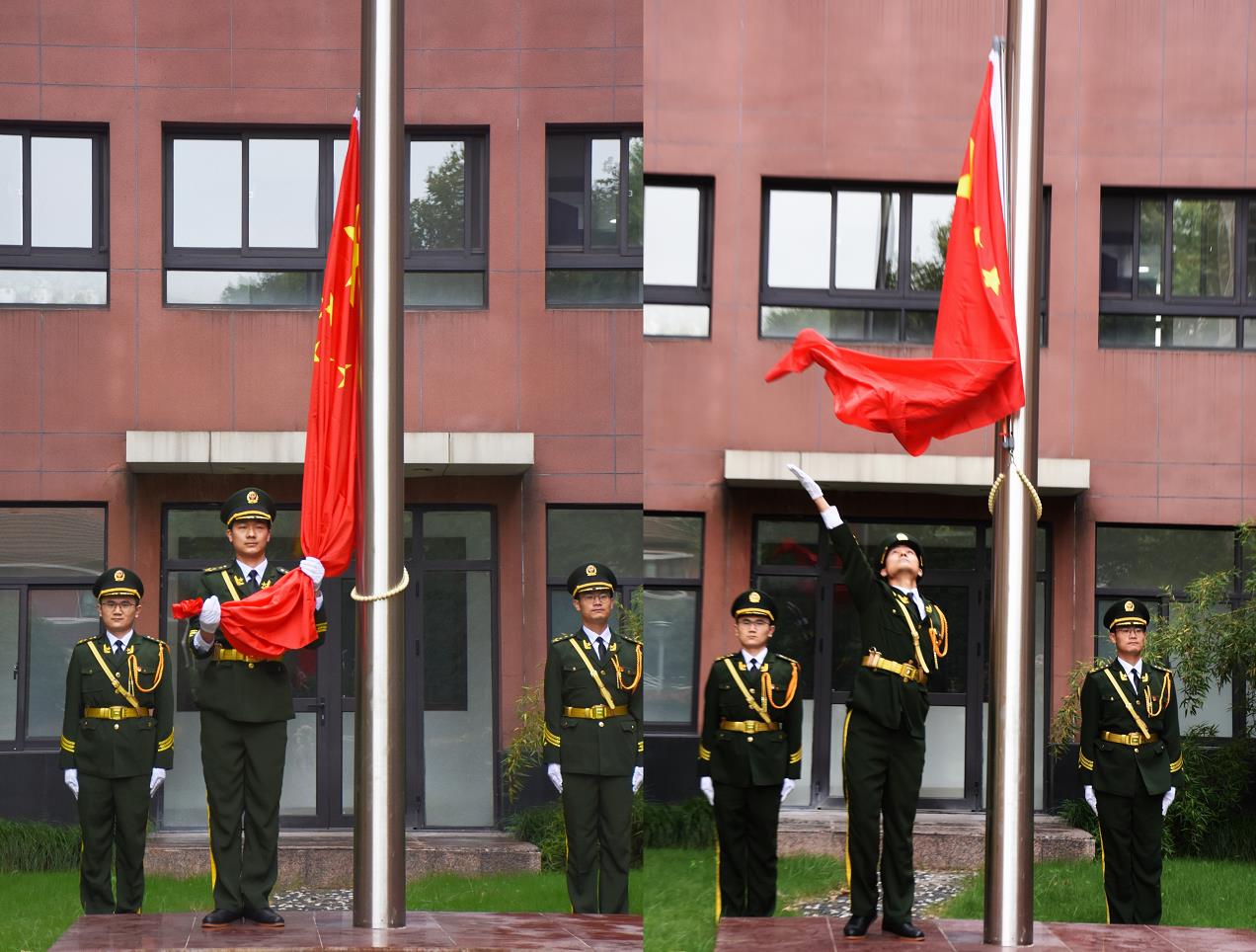 “升國旗,奏國歌,向國旗行注目禮!” 隨著《國歌》響起,升旗手振臂揚起,全體唱國歌,目送五星紅旗冉冉升起,迎風(fēng)飄揚。
