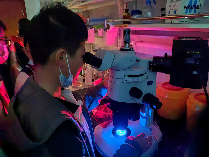 在強調(diào)了實驗室安全規(guī)范后,科普志愿者將參觀者分為多個小組,帶領(lǐng)他們比較了不同年齡階段線蟲的運動狀態(tài)、年輕小鼠與年老小鼠的差異,講解了全息光學(xué)成像等多種儀器設(shè)備的用途,解讀了利用空間光調(diào)制器實現(xiàn)全息三維成像的原理,展示了通過光遺傳方法控制小鼠癢覺的過程,并讓他們近距離地觀察了胚胎的顯微注射。同學(xué)們對熒光蛋白在生物學(xué)領(lǐng)域的應(yīng)用有了一個初步的了解,在看到標(biāo)記有熒光信號的五顏六色的神經(jīng)組織時,他們表現(xiàn)出對從事科研的向往之情。