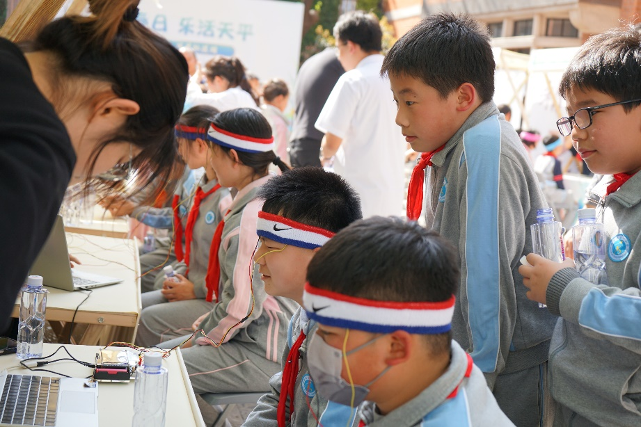 “腦智擘未來”科普市集聚焦腦科學(xué)領(lǐng)域,通過僵尸跳舞、腦電對抗、力量召喚閃電、斑馬魚的裙擺、腦電協(xié)作、眼控避障、腦功能水平測試等七個生動有趣的實(shí)驗(yàn),讓來自位育初中、建襄小學(xué)、徐匯一中心、高安一小的中小學(xué)生,以及街道的居民,初窺大腦的奧秘。系列實(shí)驗(yàn)由腦智卓越中心科普協(xié)會根據(jù)日常科學(xué)實(shí)驗(yàn)原創(chuàng)制作而成,實(shí)驗(yàn)充分結(jié)合公眾對社交化、娛樂化、游戲化等科普內(nèi)容的偏好,使得曾經(jīng)“高冷”的專業(yè)操作,以更多元、更新潮的方式綻放科學(xué)的魅力。