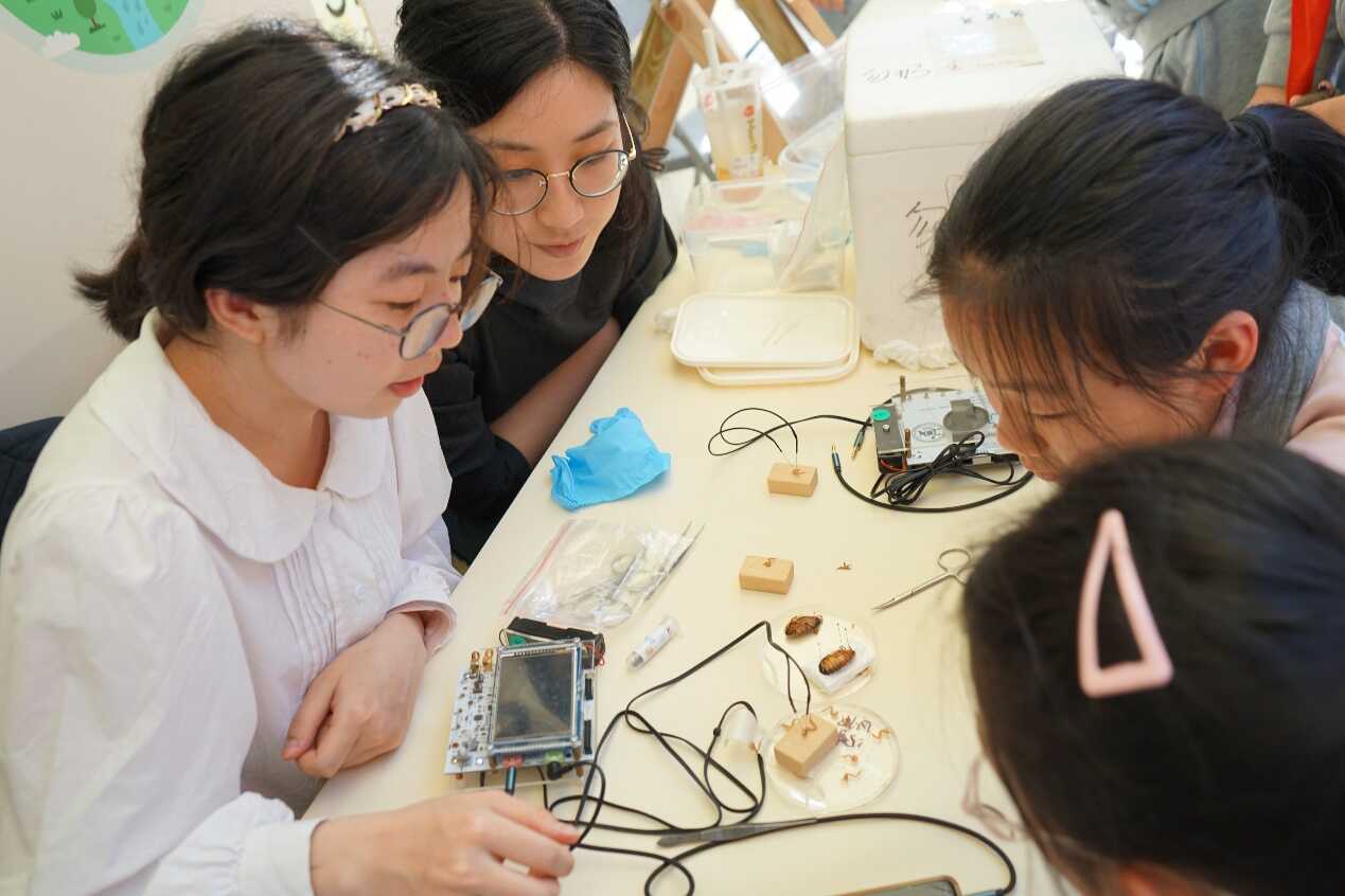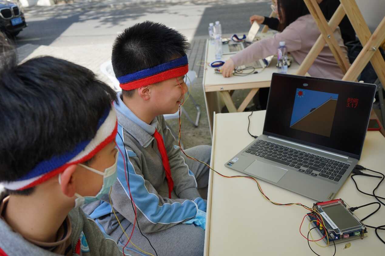 開幕式上,兩名小朋友做代表上臺體驗(yàn)“腦功能水平測試”,通過標(biāo)準(zhǔn)化、定量化指標(biāo),自主化檢測大腦的記憶、注意力等各項(xiàng)大腦功能。在發(fā)光的肌肉展臺,小朋友們都想看看自己的肌肉是不是夠強(qiáng)大,紛紛戴上信號采集系統(tǒng),揮舞手臂,讓“云朵”發(fā)出不同顏色的光。在腦電對抗展臺,小朋友們試圖通過背誦或做算術(shù),增強(qiáng)自己的腦電波,來體現(xiàn)自己的專注力高人一等。當(dāng)孩子們看到已經(jīng)死亡三小時的蟑螂腿還能隨著音樂有節(jié)奏地“跳舞”時,發(fā)出了陣陣驚呼聲!