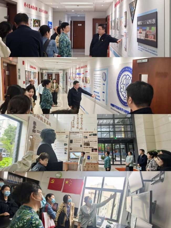 隨后,與會人員一起參觀了“腦智強國”科學家精神教育基地。腦智卓越中心黨委委員王佐仁引導大家參觀了所史墻,結合所史展示生動介紹了中心的發展歷程;支部紀檢委員韓玲講述了張香桐先生矢志報國、求真務實、逆境堅守的感人事跡,詮釋了以“仙人掌精神”為核心的科學家精神傳承。劉燮、范春等一行實地參觀了腦智卓越中心實驗動物(獼猴房)平臺,支撐平臺主管王立娜詳細介紹了動物房的標準化建設、智能化運行模式及技術服務體系。