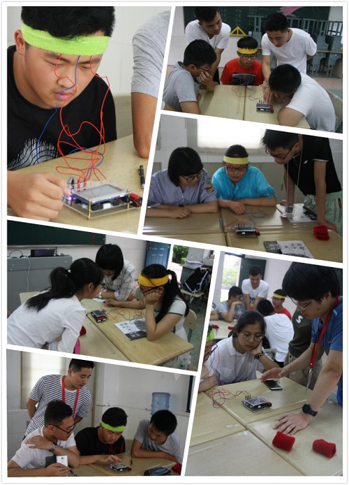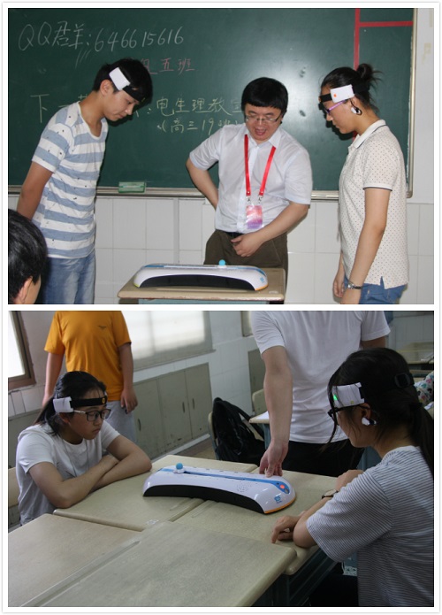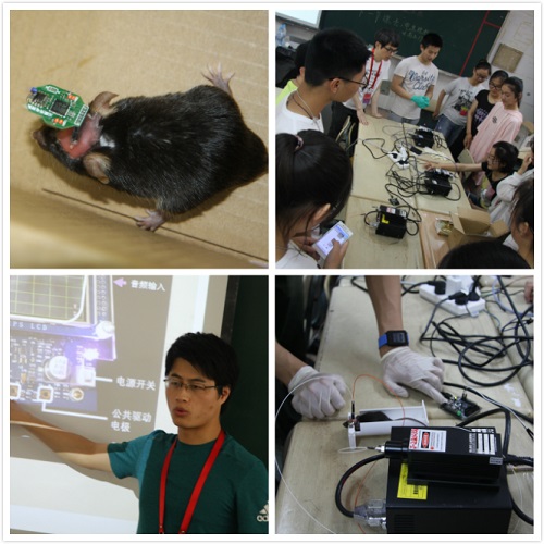 電生理組王佐仁、張翼鳳、杜久林為學生普及了神經(jīng)細胞電活動的產(chǎn)生與傳播的科學知識,以及可視化觀察和研究大腦、記錄神經(jīng)活動的不同方法,讓學生明白了“腦機接口”和“腦機融合”等前沿概念,通過腦電波訓練飛行員的案例激發(fā)大家的科學想象力。科普志愿者在出發(fā)前精心設計,日夜趕工,為實驗量身定制了輕巧便捷的生物電測量儀,通過光遺傳學控制小鼠行為、測試人體生物電、腦電對抗游戲、蟑螂腿跳舞、蟑螂間諜、熱激活果蠅、監(jiān)視斑馬魚運動等實驗,來加深中學生對腦電圖、肌電圖、動作電位、反應時長等基本概念的理解。