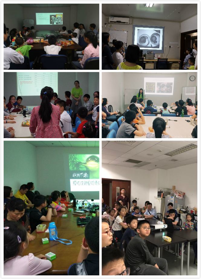 博士研究生王颯爽、汪嶼璠、徐佰杰、章彤彤、高樹琛、陳榮分別為參觀者做了題為“酸甜苦辣(痛)”、“斑馬魚的行為研究”、“斑馬魚的胚胎發育”、“模式生物里的青蛙王子”、“生命編碼”、“拳王的落敗”科普講座,深入淺出地介紹了斑馬魚、小鼠、非洲爪蟾是如何作為模式動物被應用于神經科學領域的,講解了帕金森疾病、疼痛的成因及現有的治療策略,普及了目前世界上最先進的CRISPR/Cas9 DNA編輯技術。制作精美的PPT,加上有趣的事例和通俗易懂的語言,充分激發了小朋友們對腦科學的濃厚興趣,每個報告都反響熱烈,他們踴躍地提出自己的問題,神經所科普志愿者耐心地逐一給予了解答,現場互動氣氛十分活躍。