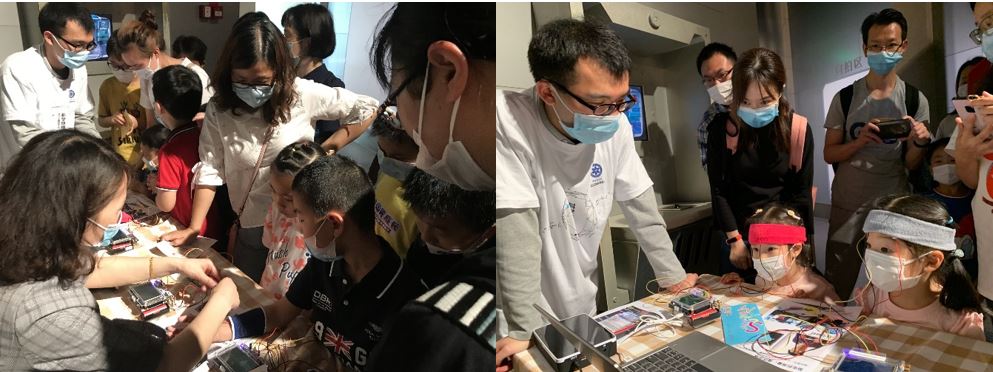 小朋友們爭先恐后地測量腦電、肌電,并根據志愿者的引導嘗試捏緊拳頭,觀察肌電發生的變化;小朋友在前方充分發放腦電,家長們則在后方目不轉睛地、緊張地觀察自家小孩和別人家小孩腦電對抗的動態變化和一較高低的結果!