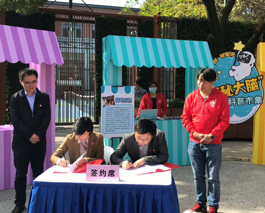 66梧桐院-鄰里匯“探秘大腦”科普市集啟動儀式上,腦智卓越中心黨委副書記兼紀委書記王茂華與天平街道黨工委書記高路簽署了《徐匯區(qū)區(qū)域黨建促進會天平分會結(jié)對共建協(xié)議書》,街道給中心贈送了“天平街道新時代文明實踐點”銘牌。兩家單位將從黨建共建、群團共建、人才共建、文明共建、科普共建等五大板塊深挖合作,充分利用自身資源優(yōu)勢,緊密結(jié)合社區(qū)建設的實際,做到精神文明建設上相互促進,物質(zhì)文明建設上相互幫助,助力社區(qū)科普教育常態(tài)化。