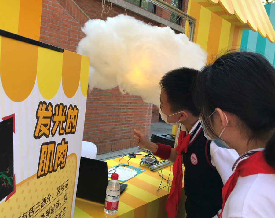 在發(fā)光的肌肉展臺,無論是奧運冠軍還是小小孩,都想看看自己的肌肉是不是夠強大,紛紛戴上信號采集系統(tǒng),揮舞手臂,讓“云朵”發(fā)出不同顏色的光。奧運冠軍微微用力,“云朵”就發(fā)出強烈的藍光。