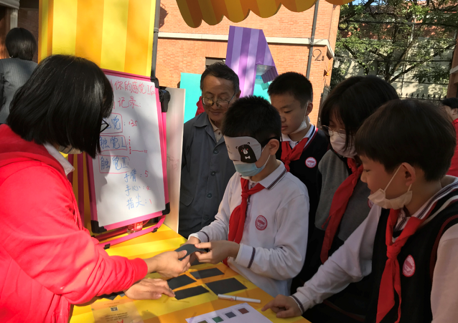 在感覺敏銳度展臺,小朋友們饒有興致地測試自己對粗糙程度的感覺敏銳度和對顏色的敏銳度。