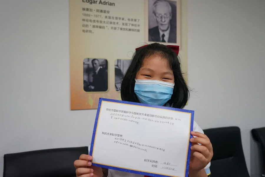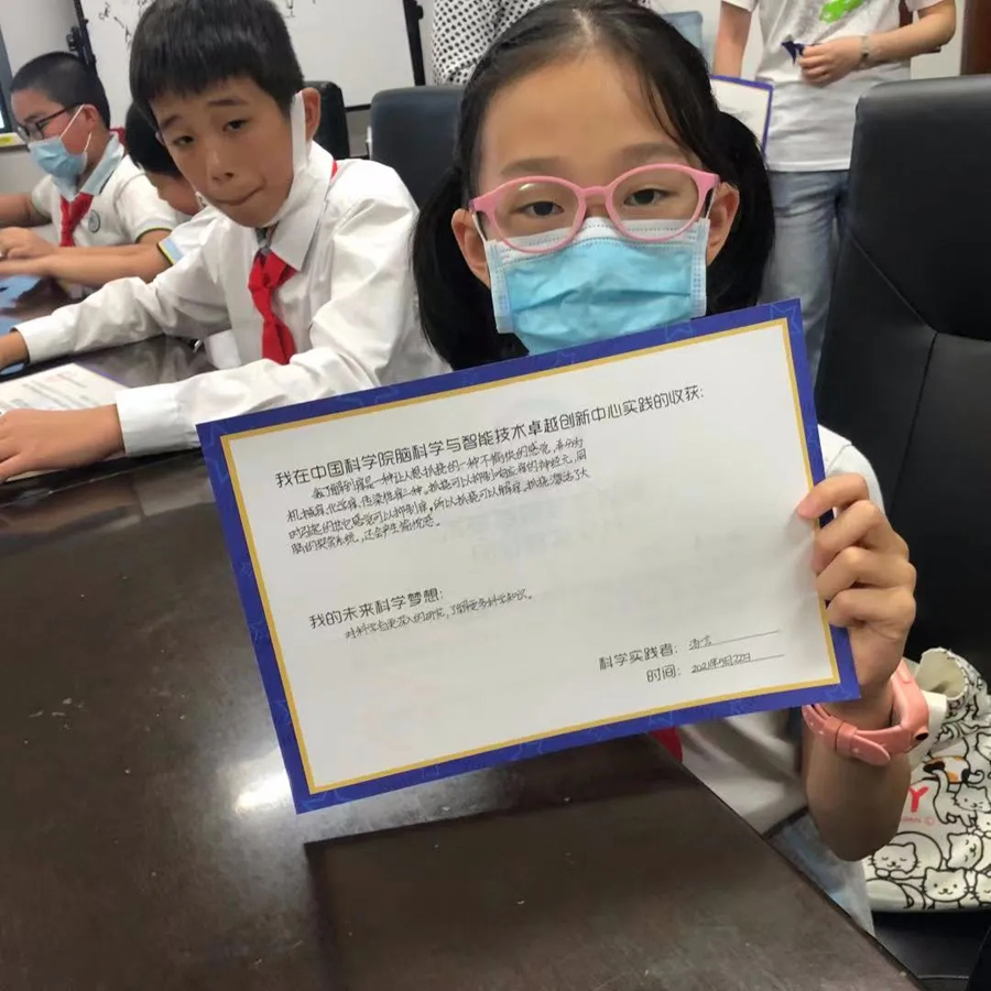 活動中,志愿者們帶領大家充分感受了科學研究的過程,從提出科學問題,到設計實驗,采集數據,再到結果分析,最終得出結論,使得同學們對科學研究有了一個初步的認識,大家紛紛在科學實踐證明上寫下自己的收獲和科學夢想,有不少同學認為增長了科學知識,立志做科學家,打造中國的科研設備。一些同學獲得了神經元3D水晶模型,對神經元有了更加深入的思考。