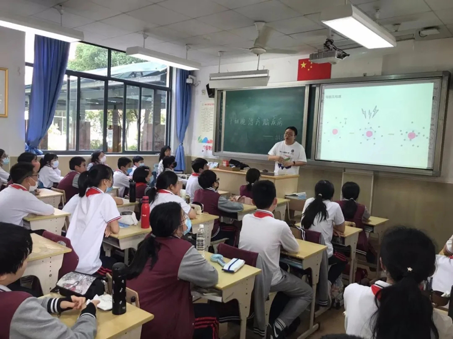 5月21日下午,中科院腦智卓越中心李毅研究員、竇艷儂副研究員、李葉菲博士、蔣夢萍博士、焦卓磊博士、王瑩博士、胡港研究生、吳超研究生根據位育初中各班級的特點,量身定制了“心靈閃電”“不耐痛是矯情么”“大腦通識”“共情背后的秘密”“神奇的下丘腦”“無創腦調控”“干細胞治療腦疾病”“神奇動物睡哪里?” 八個主題的科普講座。科普志愿者通過大量通俗易懂的視頻、音頻及圖片資料,為初一八個班300多名同學們普及了腦神經方面的科學知識。由于題材新穎,事先準備充分,語言生動活潑,四十分鐘的課上,同學們被貼近生活的事例,新鮮有趣的知識深深吸引。現場每個問題都能得到同學們的踴躍討論、發言。一些課外知識豐富的同學更是大膽質疑,提出自己的困惑。科普講座不僅激發了同學們對生活中科學知識的探索欲,了解到不少生活中的科學常識,更是增長了學生熱愛生命、熱愛生活的美好情感。