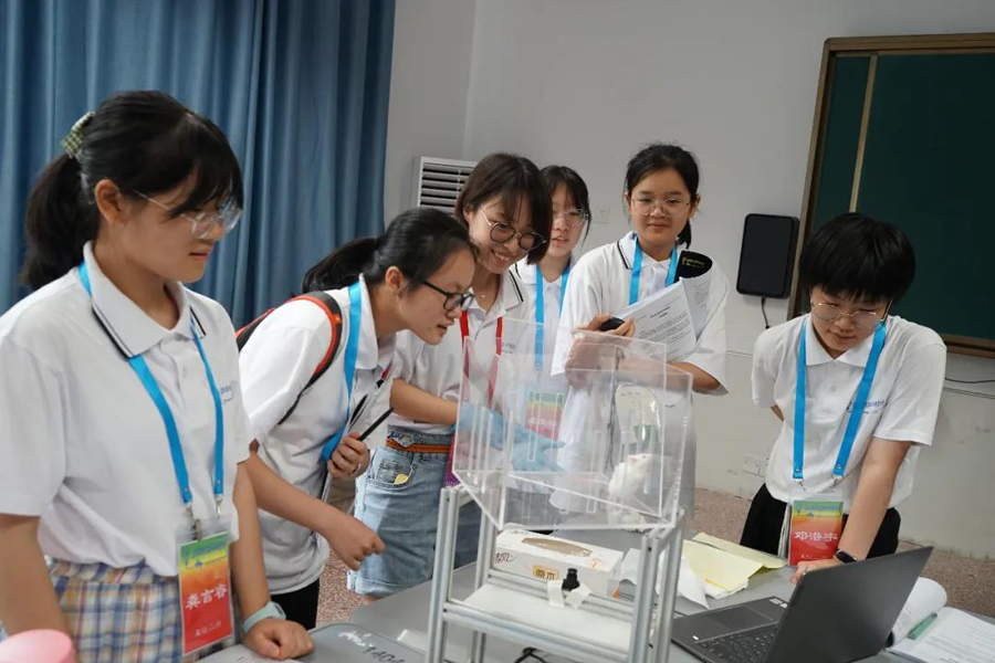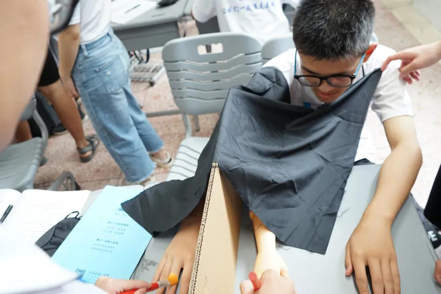 科普志愿者帶領營員們開展了空間視覺錯覺、味覺嗅覺整合、顏色與字意沖突、假手錯覺等經典實驗,了解大腦的功能;通過自制條件化裝置,以小鼠為實驗對象,探索了動物社交等級、動物感覺測量、動物運動能力測試的研究范式,引導營員們建立科學思維來探索大腦的奧秘。