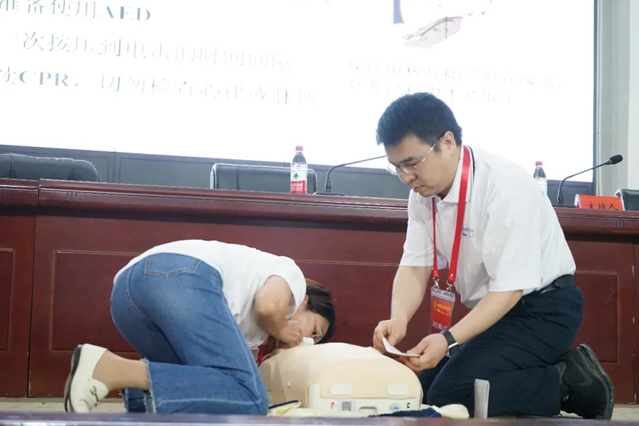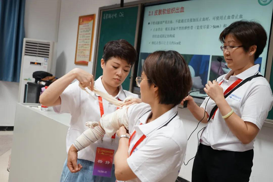 中南大學湘雅二醫院臨床技能中心主任李瑛教授為營員們詳細講解了心肺復蘇、傷口處理等急救知識,劉振江副主任醫師與志愿者們進行了現場演練,并對每個學員的急救細節逐一進行了指導。