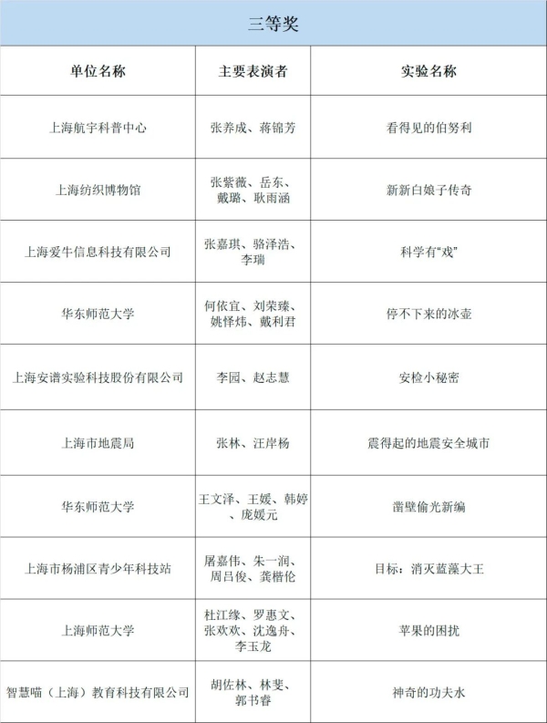 根據上海市疫情防控要求,為盡可能減少全市選手參賽聚集,降低新冠疫情傳播風險,2022年上海市科學實驗展演匯演活動,于7月26日以選手提交參賽視頻、評委線下打分的形式展開,整場比賽最終評選出一、二、三等獎及優秀獎。(評選現場及獲獎名單↓↓↓)