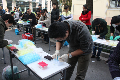 本次插槍頭比賽,每個(gè)課題組選派一男一女參加比賽。 比賽在既緊張又歡快的氣氛中進(jìn)行,比賽過程中,無論你是新進(jìn)的學(xué)生,或是歷練多年的大師兄、大師姐,還是發(fā)號施令的課題組管家,做的都是一樣的動(dòng)作。本次比賽規(guī)則為每人插3盒槍頭(1mL、200μL、10μL),每一輪中,最先插完的前四名勝出,通過四輪比賽,勝出的16名人員再進(jìn)行決賽,分別決出了男女前三名:周子量、譚國鶴、曾學(xué)志、聶琰珍、尹延青、鄧菡菲。