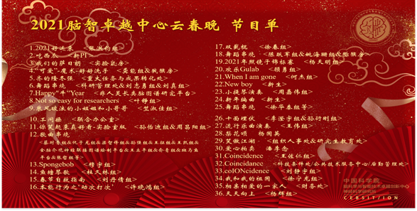 張燈結彩精神爽,辭舊迎新樂開懷。為讓廣大職工、博士后和學生們擁有一個快樂健康而有紀念意義的春節,腦智卓越中心工會、團委、研究生會于2月9日下午舉辦了“云·迎新聯歡會”活動,本次活動首次采用線上直播和線下分會場相結合的方式,為海內外的職工和師生送上新春美好的祝福。