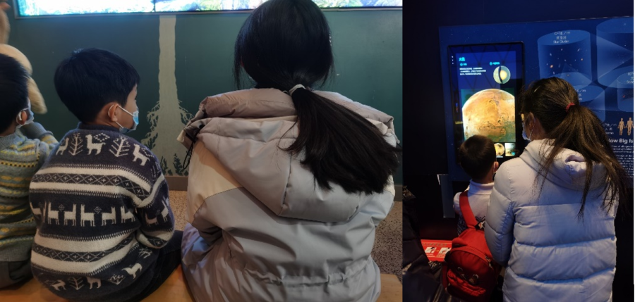 活動中,志愿者們帶著孩子們走進了上海自然博物館。從宇宙起源到物種演化,琳瑯滿目的精彩展品讓孩子們睜大了眼睛。大家搭上時光列車,依次前往感受137億年前的宇宙大爆炸的壯觀場面和地球形成之后的生命奇跡。寒武紀的古特提斯海藍色的海水照亮了孩子們臉上的好奇。