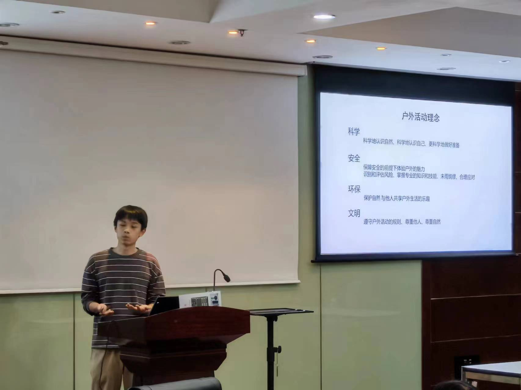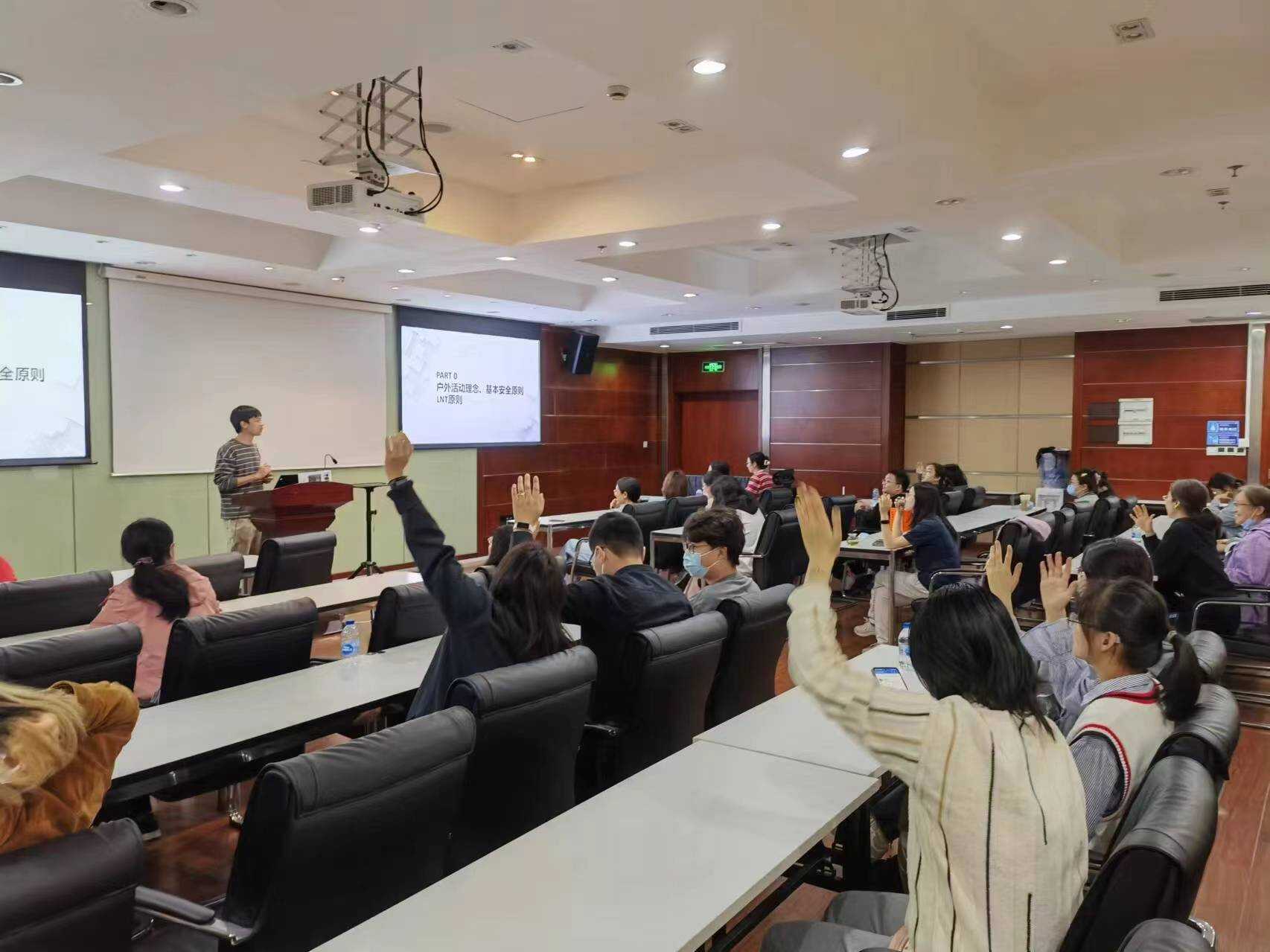 戶外運動不僅可以提升身體素質,緩解工作壓力,而且能夠培養勇攀高峰的精神。講座特邀復旦大學登山協會領隊余炅昊做報告,從科學、安全、環保、文明等方面系統介紹了戶外運動的基本理念、活動類型、經典線路,講解了戶外活動的準備工作和基本安全常識;報告提醒戶外運動愛好者牢記“三新不出、四人結伴、物資四三三分配”原則;特別強調了LNT環保法則,倡導戶外運動愛好者安全文明地與大自然互動,減少人類對大自然環境中原生動植物的負面影響,做到人與自然和諧。