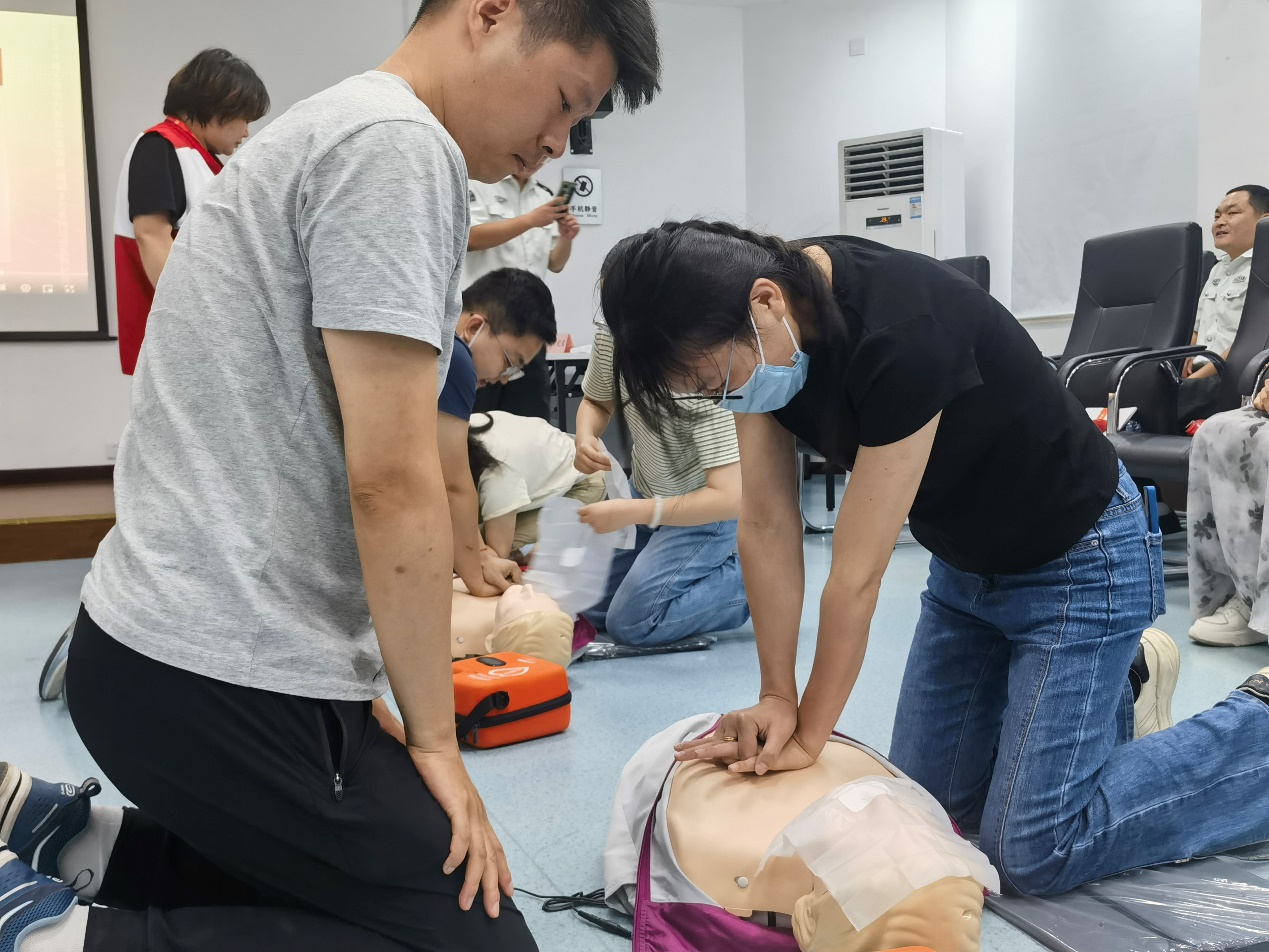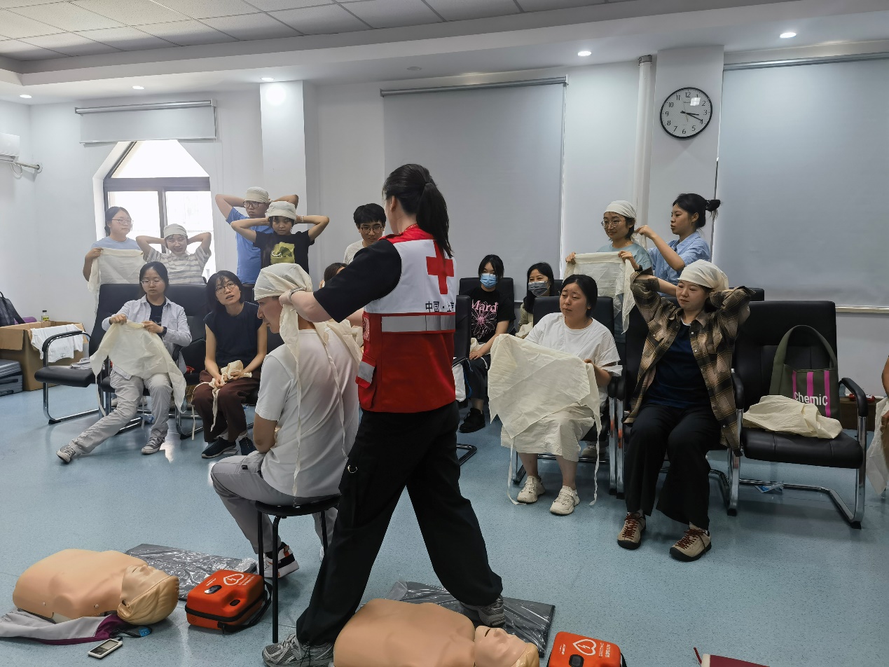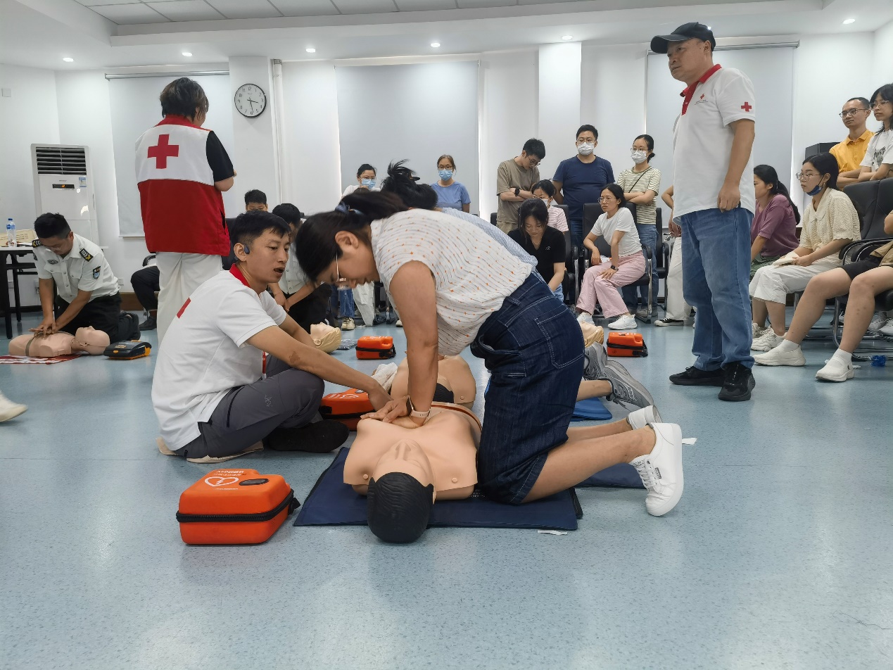 上海市紅十字會送課上門,紅十字事務中心的講師現場講解了紅十字現場急救的原則、目的和程序等基本常識,并演示了心肺復蘇、自動體外除顫、氣道異物梗阻處理、外出血的止血包扎、骨折固定等應急救護技能。學員們被分成三個小組進行實操訓練,利用人體模型進行急救模擬。培訓老師對每位學員的操作進行了指導和考評,確保每位學員都能掌握正確的應急救護技能。