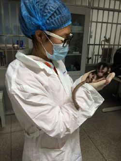 第二天下午1點鐘,孕猴子宮頸依舊沒有收縮現(xiàn)象,且有粘液流出。值了一夜班的大伙兒面色疲倦,但為防止胎兒因羊水過少而窒息死亡,還是決定立即實施剖腹產(chǎn)手術。大家打起精神開始準備。手術過程中師兄、師姐運用熟練的技術在手術臺前為這個即將出來的小生命忙碌著。“出來了,出來了!”小紅師姐激動的喊著。王燕師姐捧著那小家伙,笑著走出來,大家高興地看著這個小家伙,緊張的氣氛也因此活躍起來,那一刻自己好像又重新充滿了力量,覺得所做的一切都是值得的。獸醫(yī)立即將這個小家伙放進了保溫箱,并不斷地擦拭,以免羊水堵住呼吸道。由于不足月,小家伙還不及我們手掌大,獸醫(yī)檢查后,發(fā)現(xiàn)它呼吸微弱,并逐漸沒有了叫聲,還不時地打噴嚏。心繃得都快要提到嗓子眼兒了,手術間頓時安靜得讓人緊張起來。一邊是剛生產(chǎn)完極度虛弱的母猴,一邊是瀕臨生命邊緣的小猴,每個人都有序地忙碌著、努力著,小家伙的呼吸漸漸趨于平緩,可是大家的心卻不敢放下來,小家伙太弱了還不能自主吸食,必須人工照看喂養(yǎng),每隔3至4個小時喂養(yǎng)一次,無論是白天還是黑夜,我們就這樣開始充當奶爸、奶媽的角色,以這種形式進行人工喂養(yǎng)的仔猴,我們已經(jīng)記不清有多少只了,可每次我們都都因為又撫養(yǎng)了一個小生命,而覺得自己好偉大。