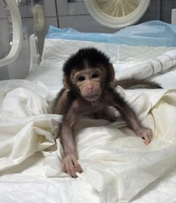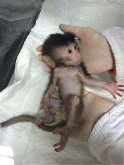不是每一個生命都能順利的來到這個世界上,有些新生命的誕生總伴隨著曲折和艱難,至此之下總有很多人為之努力著。14年11月17日那一晚便是如此,晚上八點鐘,外面一片漆黑,我們這些隨時待命的工作人員依然按照慣例巡查動物房,借著月光來到飼養(yǎng)間。大家看到血跡后,趕緊觀察孕猴,發(fā)現(xiàn)其陰道口已打開,這是早產(chǎn)的征兆,王燕、小紅師姐以及小李師兄等人趕緊一同商量對策。這種突發(fā)情況對于我們來說早已是常事。可是每一次我們都不敢怠慢,隨即做了B超等常規(guī)檢查,小家伙的胎心正常,我們決定等其自然分娩。直到午夜12點,母猴還未見任何生產(chǎn)跡象,我們的心又懸了起來,擔心難產(chǎn)等意外的發(fā)生,就這樣,我們像往常一樣值班守夜。這一夜過得如此漫長,心里似乎泛起層層波瀾,覺得委屈了自己,好想念太陽出來天亮的時刻,扭頭看師兄、師姐們,竟也和我一樣……