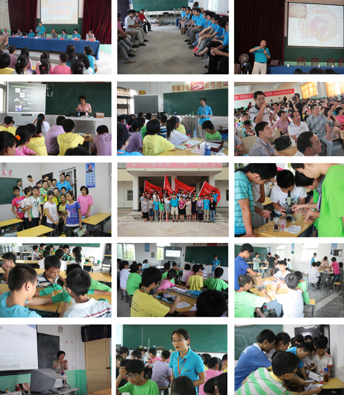 為使活動更科學合理,符合學生的喜好與接受能力,志愿者們在出發前一個星期,邀請延安中學、西南位育經驗豐富的老師和華師大研究教學法的專家,對課程提出了修改意見。參加夏令營的300多個學生被分為五個小組,每個小組下設兩個班級。光電魔術小組在出發前精心設計,日夜趕工,焊接了電子積木,通過電子積木、水果制作的簡易發電設備、土電話等,讓大家掌握了電學、聲學的很多基本原理。化學調色板小組通過自制 pH 試紙測定蔬菜水果的pH 值、銀鏡反應、牛奶作畫、制作彩焰蠟燭、結晶等小實驗,引領大家進入神奇的五彩繽紛的化學世界。感受感覺小組介紹了視覺、聽覺、嗅覺、味覺、觸覺、錯覺的產生原理,并進行了動物及人體實驗。微觀世界小組帶領營員們采集身邊的土樣水樣,通過顯微鏡了解其中所包含的生物種類、形態差異及個體行為等;并開展了簡單的微生物培養、觀察、無菌操作及抑菌實驗。蟲蟲特工隊小組在戶外采集昆蟲,并分類制作標本,了解形態結構及功能差異;利用昆蟲行為觀察平臺,研究特定昆蟲在有溫度梯度時對溫度的偏好性;通過自制條件化裝置,以斑馬魚或其它小型魚類進行簡單的學習與記憶實驗。