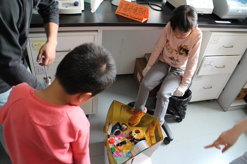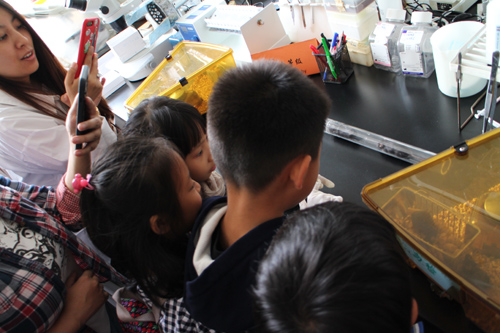 在強調了實驗室安全規范后,神經所科普志愿者將參觀者分為多個小組,帶領他們參觀了質粒抽提過程和小鼠免疫組化等實驗,講解了各種儀器設備的用途,介紹了實驗動物模型大鼠和小鼠,并讓他們進行了近距離的觀察了小鼠的對抗行為。
