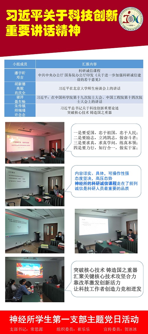 2018年10月底,神經所各支部紛紛積極組織開展了“講愛國奉獻,當時代先鋒”主題活動,學習宣傳貫徹《中國共產黨紀律處分條例》,學習習近平總書記有關科技創新重要講話精神。