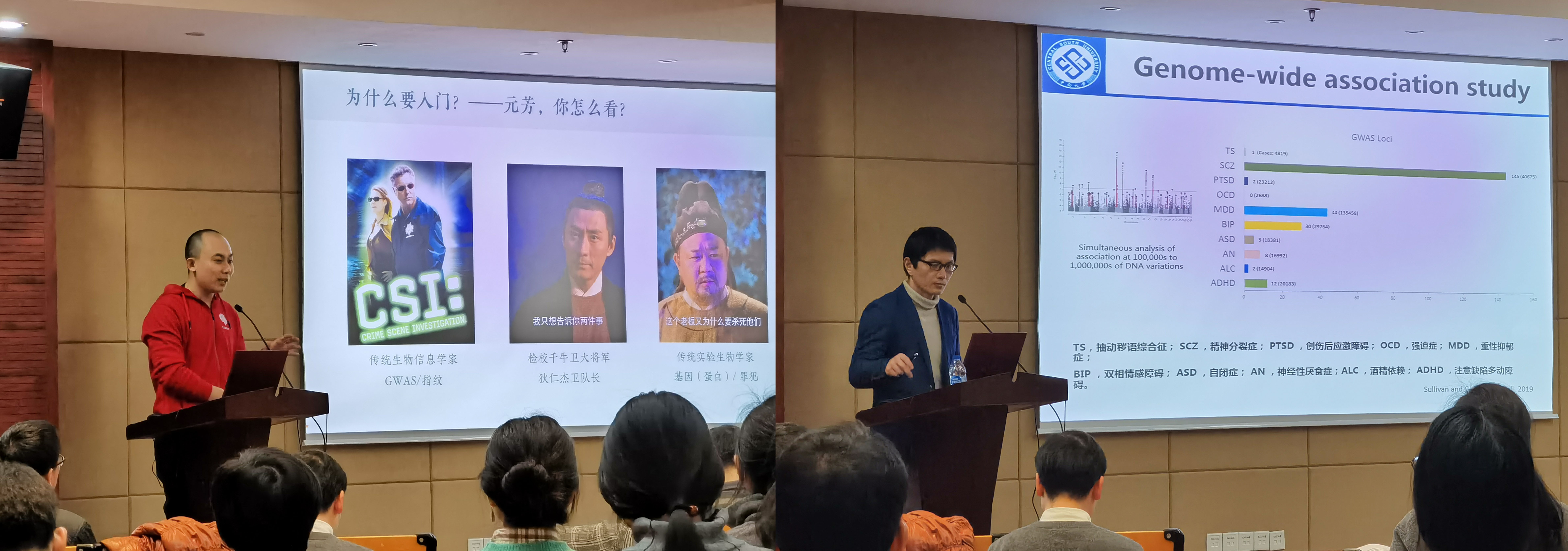 論壇由袁博博士《高通量數據分析"從入門到放棄"》作引,通過介紹處理孤獨癥家系全外顯子測序數據的經驗,分享高性能計算平臺的應用技巧,分享利用相關數據庫提高實驗效率的實戰心得。特邀中南大學生命科學學院副院長陳超教授作《人腦多組學調控與精神疾病》的報告,就全基因組關聯分析(GWAS)發現的一大批和精神類疾病相關的基因信號的作用識別的分析為大家闡述了多組學網絡分析策略的應用及相關進展。