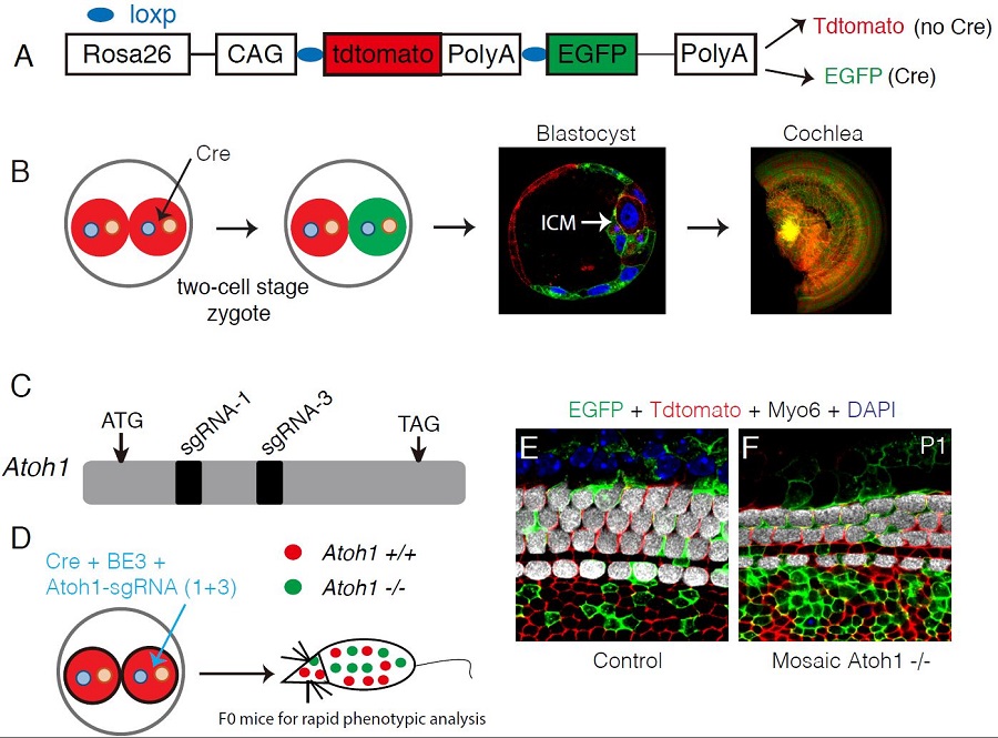 圖1: 利用Atoh1驗(yàn)證嵌合型突變方法的可靠性。(A)雙報(bào)告基因小鼠的模式圖。沒有cre表達(dá)時(shí),所有細(xì)胞表達(dá)紅色蛋白。反之,有cre表達(dá)時(shí),細(xì)胞關(guān)閉紅色,開始表達(dá)綠色蛋白。(B)二細(xì)胞期受精卵的一個(gè)細(xì)胞注射cre, 內(nèi)生細(xì)胞團(tuán)(inner cell mass,ICM)和耳蝸(cochlea)同時(shí)含有綠色和紅色的細(xì)胞。(C)Atoh1基因兩個(gè)高效的sgRNA(1+3)的位置示意圖。(D)在二細(xì)胞期受精卵的一個(gè)細(xì)胞內(nèi)注射cre, 單堿基編輯系統(tǒng) (BE3) 和 2個(gè)針對(duì)Atoh1基因的sgRNA(1+3), 直接產(chǎn)生的F0小鼠是嵌合型純合突變,可以用于快速的表型分析。(E-F) 相對(duì)于對(duì)照組(E), 嵌合型純合突變小鼠耳蝸的毛細(xì)胞數(shù)量顯著減少。