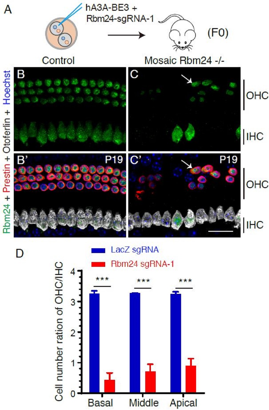 圖2: 利用嵌合型突變方法快速鑒定出Rbm24是維持耳蝸外毛細(xì)胞存活的重要基因之一。(A)二細(xì)胞期受精卵的其中一個(gè)細(xì)胞注射更新版本的單堿基編輯系統(tǒng)(hA3A-BE3) 和 Rbm24特異的sgRNA-1,直接產(chǎn)生的嵌合型純合突變F0小鼠可以立即用于表型分析。(B-C’) 相對(duì)于對(duì)照組 (B 和B‘), 嵌合型純合突變耳蝸(C和C’) 的外毛細(xì)胞大量死亡。白色箭頭所示是殘留的、依然表達(dá)Rbm24的外毛細(xì)胞(Prestin+)。(D) 跟注射LacZ sgRNA (藍(lán)色)的對(duì)照組相比,實(shí)驗(yàn)組(紅色)的外毛細(xì)胞數(shù)量顯著降低。