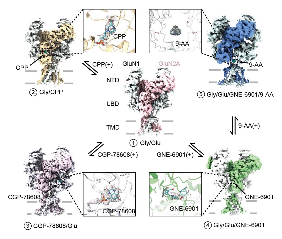 圖1 | 冷凍電鏡解析不同狀態下人源GluN1-GluN2A NMDA受體