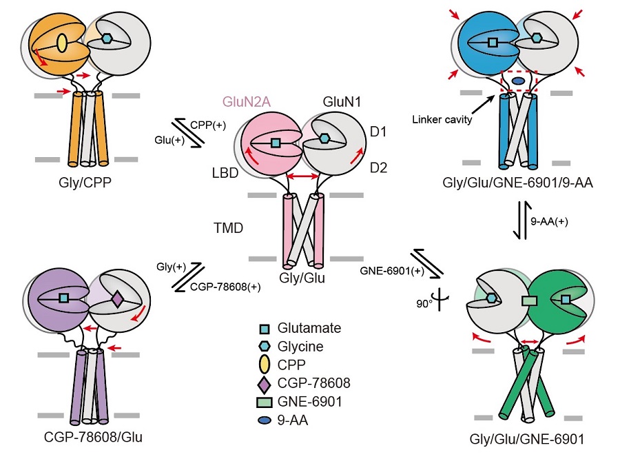 NMDA受體作為一類重要的興奮性離子型谷氨酸受體,在神經系統發育形成與突觸可塑性中發揮重要功能。NMDA受體通常由兩個結合甘氨酸的必需亞基GluN1和兩個結合谷氨酸的可變GluN2亞基(2A-2D)組成異源四聚體離子通道蛋白。其功能異常與中樞神經系統和精神疾病(如抑郁癥、精神分裂癥、帕金森病和阿爾茲海默癥等)有密切的關聯性。這些神經和精神疾病給患者及病人家屬帶來極大的痛苦,是亟需解決的重要臨床難題。因此,深入研究NMDA受體在生理狀態下的構象與功能,并揭示全新的小分子結合位點,對于靶向NMDA受體功能異常的新藥研發是至關重要的。