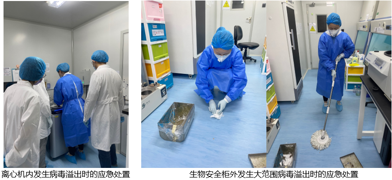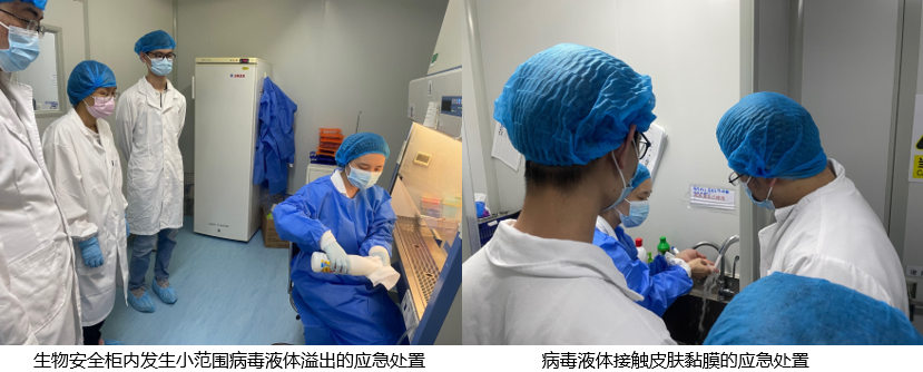 演練包含以下內(nèi)容:一、生物安全柜內(nèi)發(fā)生小范圍病毒溢出時(shí)的應(yīng)急處置;二、生物安全柜內(nèi)發(fā)生大范圍病毒溢出時(shí)的應(yīng)急處置;三、生物安全柜外發(fā)生大范圍病毒溢出時(shí)的應(yīng)急處置;四、離心機(jī)內(nèi)發(fā)生病毒溢出時(shí)的應(yīng)急處置;五、病毒液體接觸皮膚黏膜的應(yīng)急處置。參加應(yīng)急演練的人員分四批進(jìn)入BSL-2實(shí)驗(yàn)室完成了應(yīng)急演練。