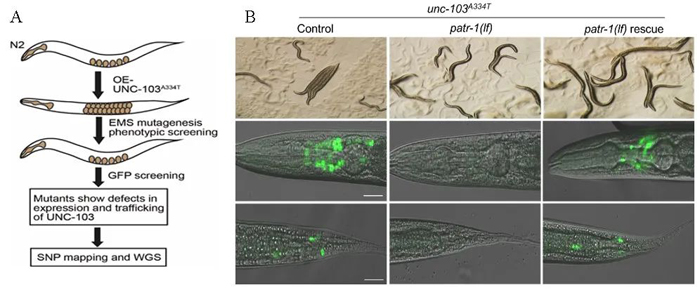 圖1. A,篩選UNC-103通道生成調控基因的策略。B,線蟲DNA拓撲異構酶2相關--蛋白PATR-1調控UNC-103通道生成。