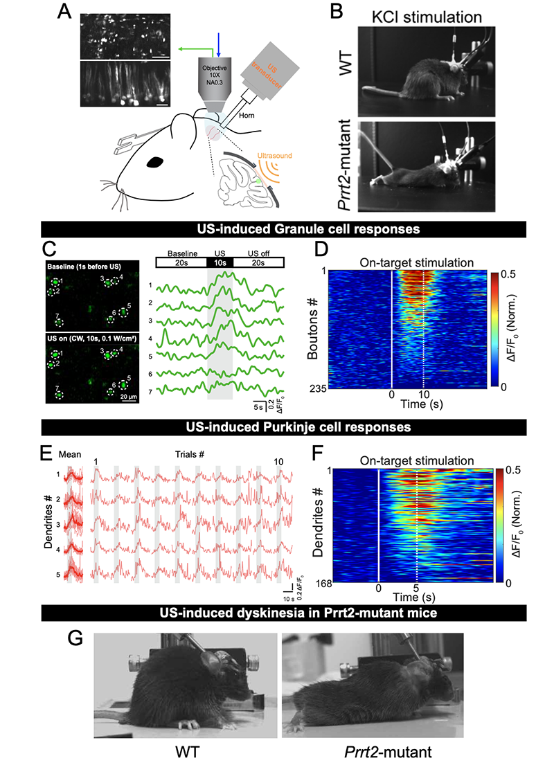圖(A)在小腦皮層進行同步超聲刺激和雙光子鈣成像。(B)Prrt2基因突變型小鼠在小腦氯化鉀刺激后出現運動障礙樣行為。(C和D)超聲誘導小腦顆粒細胞軸突末梢鈣信號上升。(E和F)超聲誘導小腦浦肯野細胞樹突鈣信號上升。(G)Prrt2基因突變型小鼠在小腦超聲刺激后出現運動行為改變。