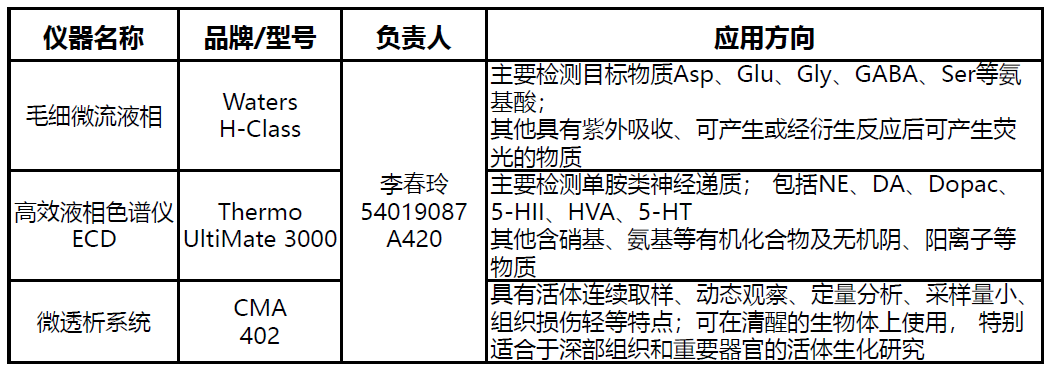 2.1. 液相實驗室位于新大樓A418現有3臺高效液相色譜儀及一套微透析系統,相應儀器型號、配置及相關應用見下表。