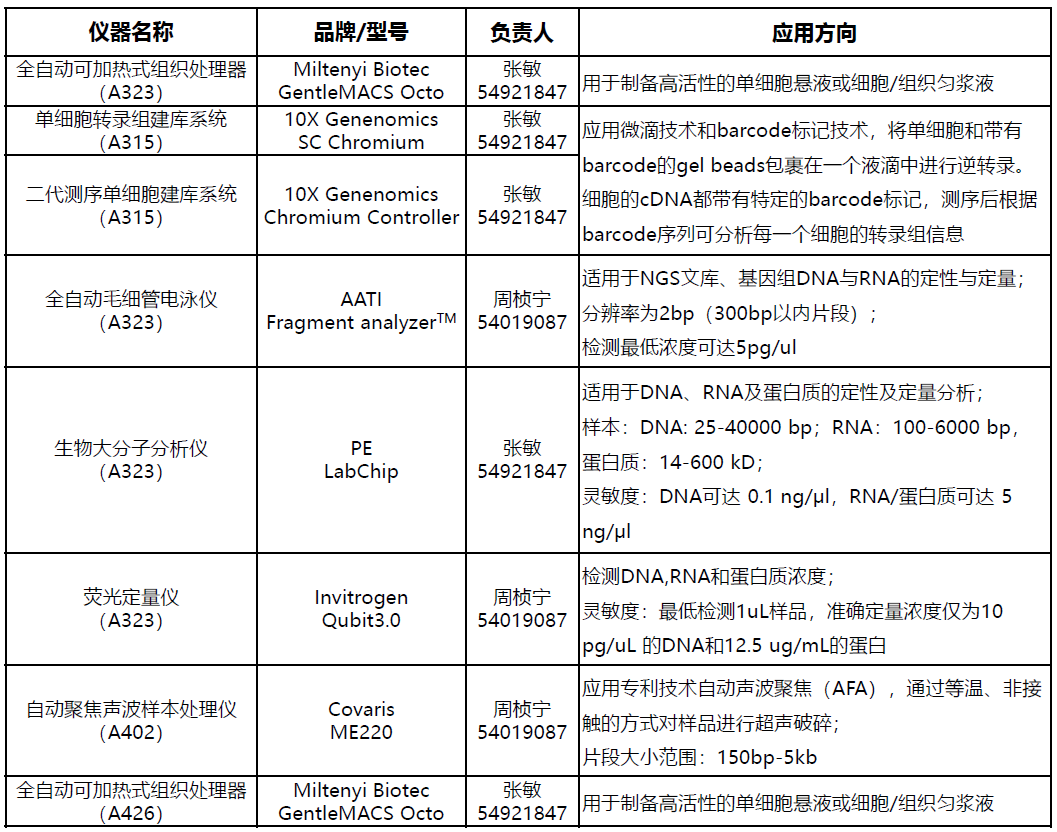 3.1. 平臺現有兩臺單細胞轉錄組建庫儀,并配有其他樣品制備及質控儀器,具體信息見下表。