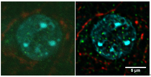 左圖為原始圖像(此標(biāo)本熒光標(biāo)記比較弱,無法獲得高信噪比的圖像), 右圖為經(jīng)過反卷積和色差校正后的圖像,使用 OLYMPUS FV-1000 PLAPON 60xOil NA. 1.42 物鏡, 采圖分辨率 xy=0.069 um/pixel, z=0.25 um/pixel