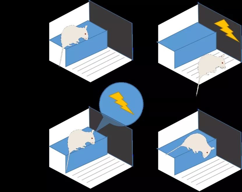 圖表 2 伸腳抑制性回避實驗。訓練時大鼠放在高臺上,下地就會受到電擊。測試時它如果記得被電擊的不愉快經歷則會不情愿下地或者下地速度減慢。圖片來源:作者改編