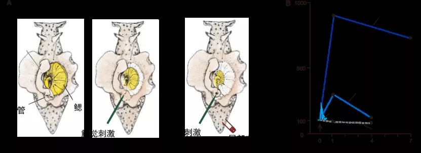 圖表 3 一個簡單的學習行為。A是海兔背部俯視圖,輕觸虹吸管會誘導其縮鰓。如果觸摸其虹吸管的同時在其尾部施加一個電擊,則縮鰓反應會增強,稱作敏化作用。B如果反復訓練多天,則這種敏化作用會變得更強,并能持續多日。圖片來源:改編自參考文獻(3)
