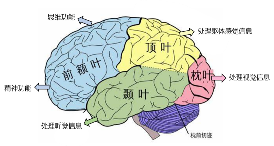 人腦主要的結(jié)構(gòu)與功能(圖片來(lái)源:《神經(jīng)生物學(xué)原理》,作者改編)