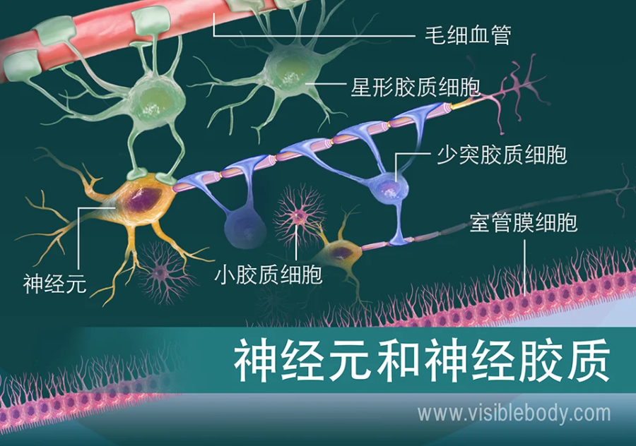 神經(jīng)膠質(zhì)細(xì)胞保護(hù),供養(yǎng)和支持神經(jīng)元(圖片來(lái)源:www.visiblebody.com)