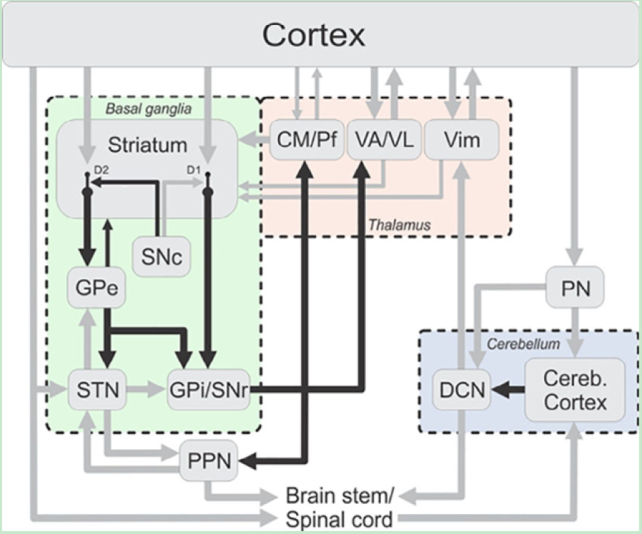 皮層-皮層下的運(yùn)動(dòng)環(huán)路,Cortex 皮層;Basal ganglia:基底神經(jīng)節(jié);Brain stem/Spinal cord 腦干/脊髓;Cerebellum 小腦;Thalamus 丘腦 (圖片來(lái)源:Movement Disorders. 2019 Aug;34(8):1130-1143)