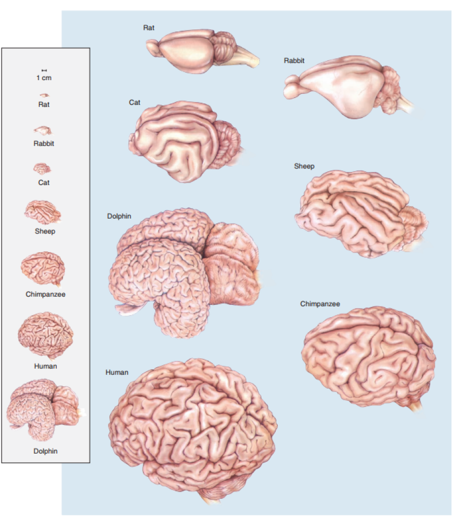不同哺乳動(dòng)物的腦對(duì)比(圖片來(lái)源Neuroscience: Exploring the Brain(2007)-Chapter7)