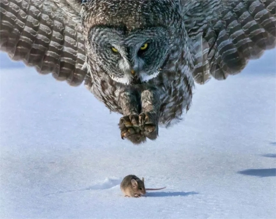有一天,貓頭鷹看到地上有老鼠,就悄悄地飛了下來。老鼠扭頭一霎那間,就看到一個黑影向它撲來,這時的它像是被冰封了——本來舉起的小胳膊也放不下了,翹起的尾巴還懸在空中。而此時的貓頭鷹,突然失去了目標,隨即調轉方向,飛向了另外一個樹干。