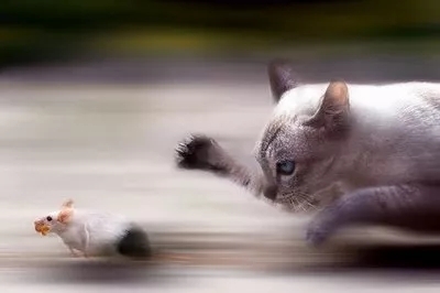 老鼠見了貓快速地逃跑