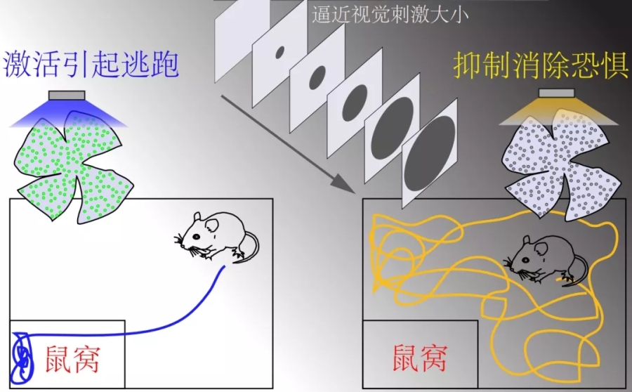 那么,研究者是如何馴服這類細胞的呢?首先,他們讓這群細胞乖乖地歇著,同時令眼睛中的其他細胞保持正常工作,此時的老鼠在看到逼近黑影時竟然不害怕了。在這之后,研究者讓這群細胞向腦中發出假的警報信號,這時,雖然并沒有逼近的黑影,但是老鼠仍然傻乎乎地逃跑了,而且被嚇得不要不要的。這些實驗證明,視網膜中的瞬時撤光型阿爾法細胞就是向腦中報告逼近黑影刺激的細胞。